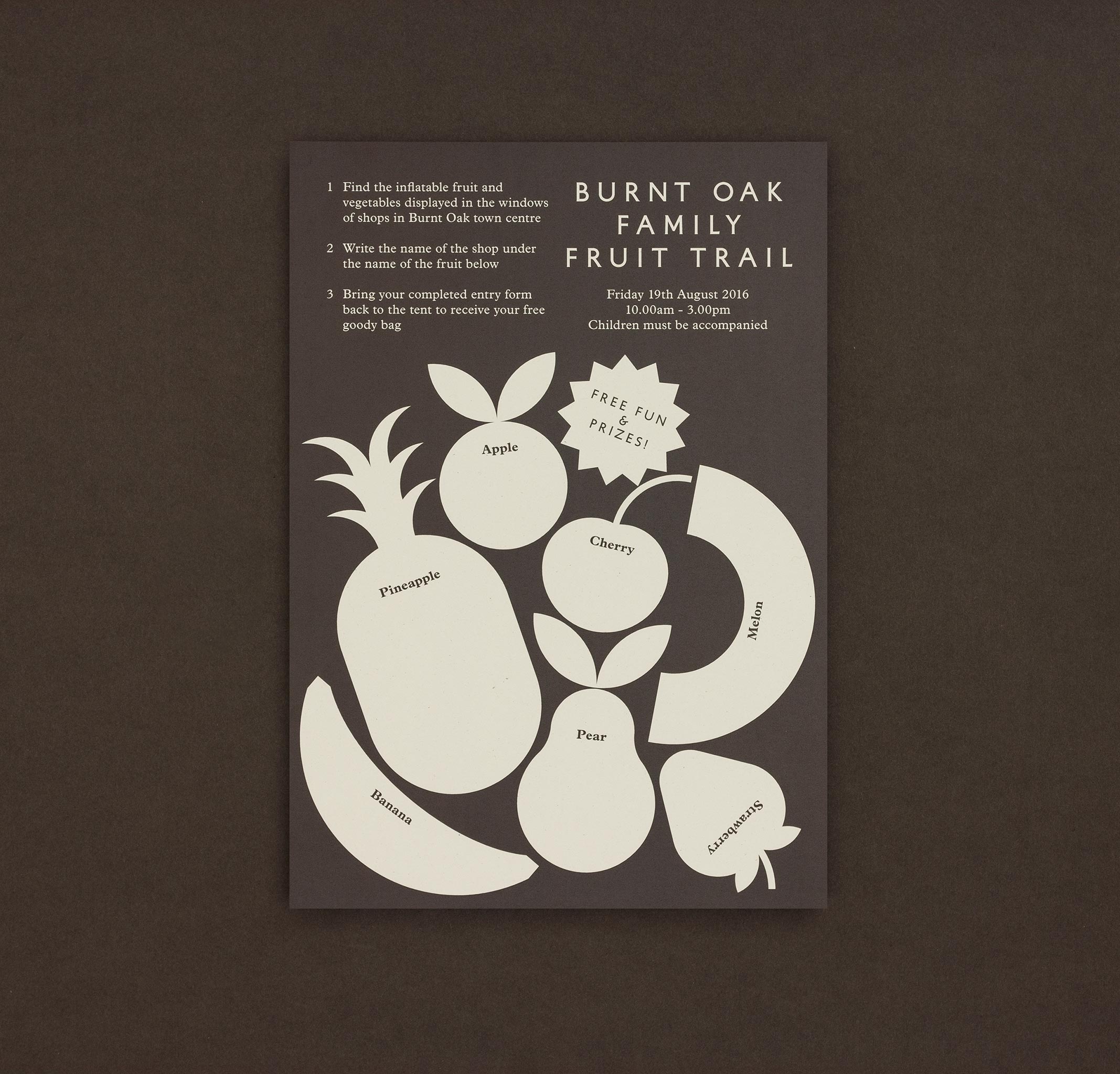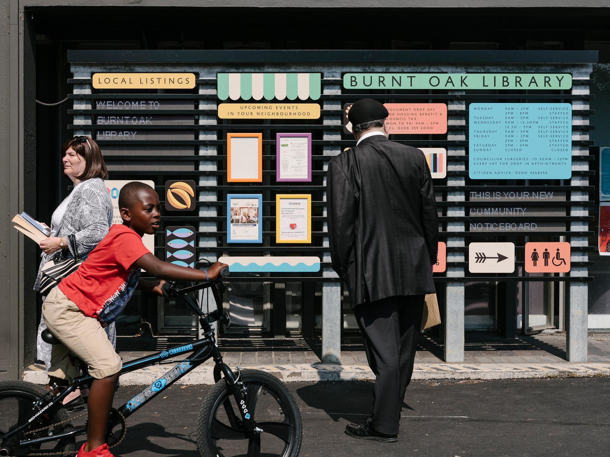 A public realm improvement scheme for Burnt Oak, a town centre in north London. Our work includes a graphic identity, wayfinding, the design of shopfronts and a new community noticeboard. Photography by Philipp Ebeling.