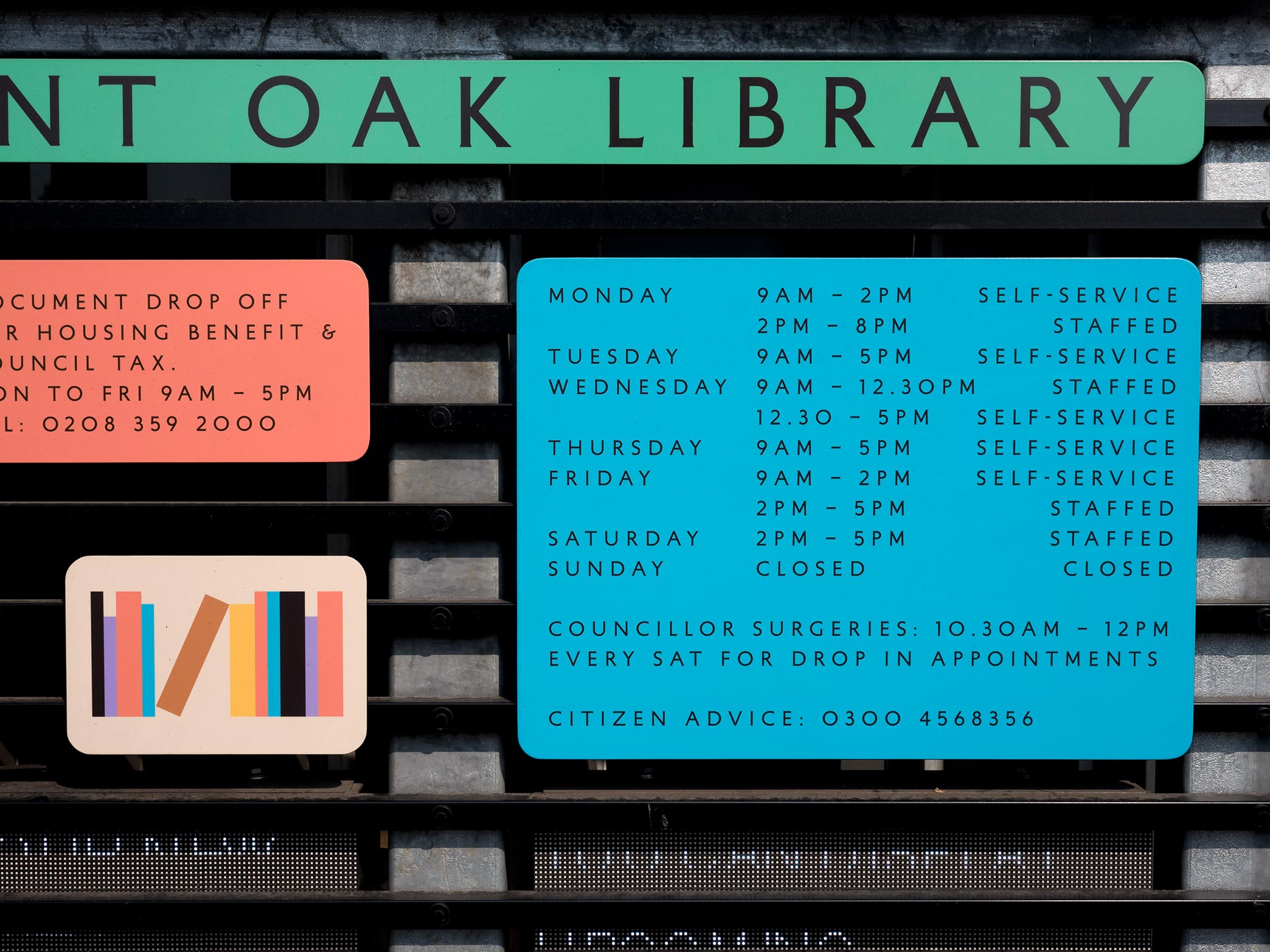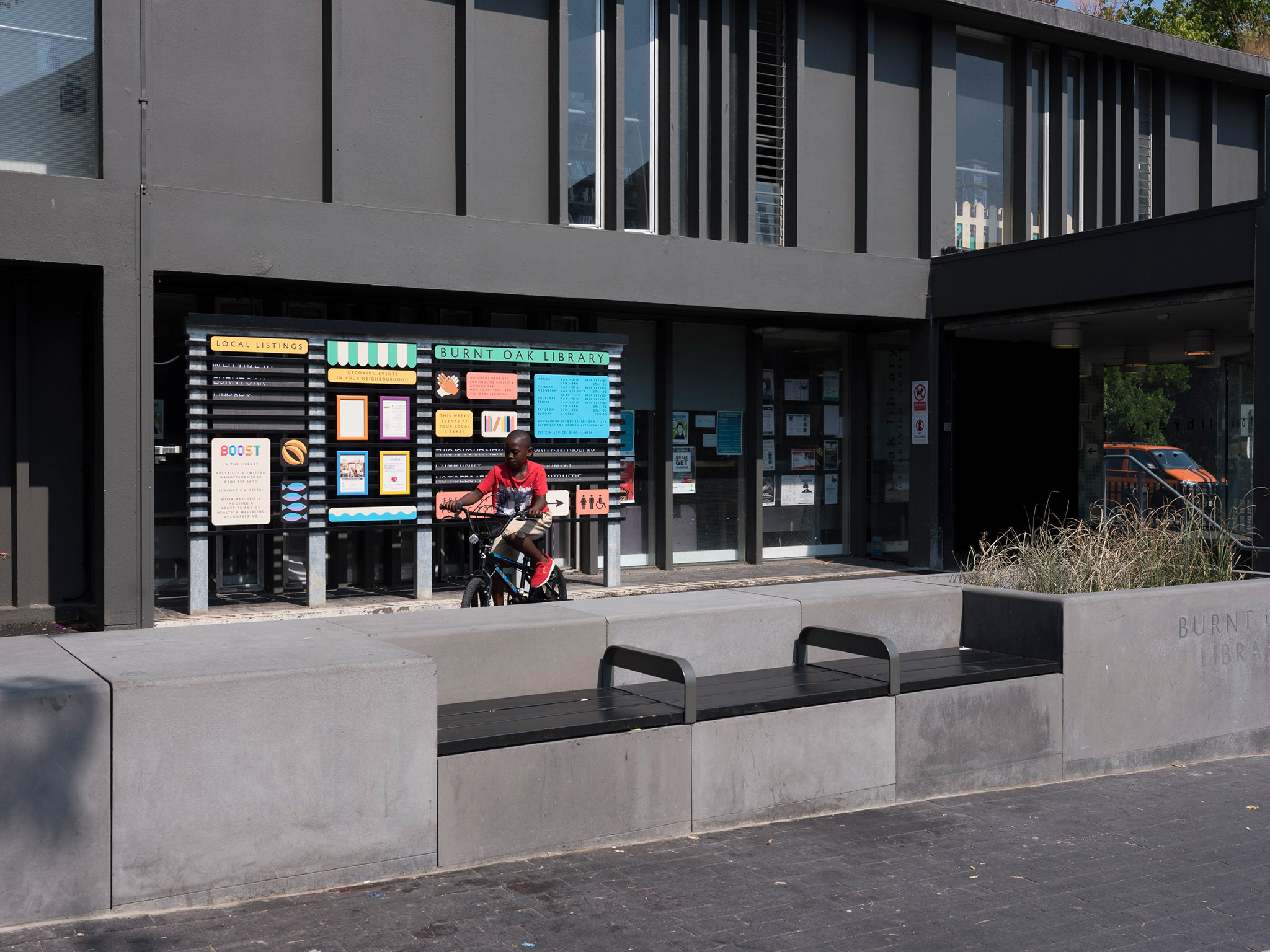 A public realm improvement scheme for Burnt Oak, a town centre in north London. Our work includes a graphic identity, wayfinding, the design of shopfronts and a new community noticeboard. Photography by Philipp Ebeling.